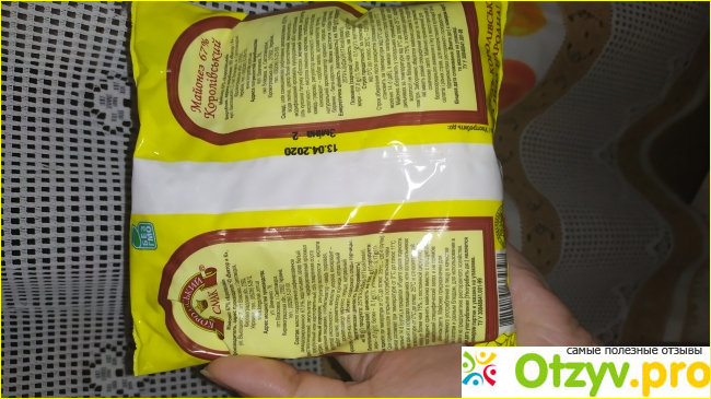 На пакете указан состав майонеза и его каллорийность. Тем, кто следит за своей фигурой, такой жирный майонез нужно кушать с осторожностью, так как он очень питательный и каллорийный.
