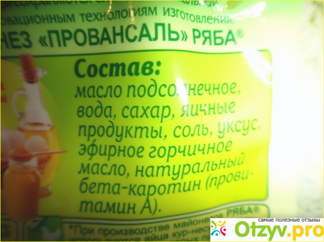 Майонез "Провансаль Оливковый" Ряба изготовлен только из натуральных ингредиентов, а именно: масла растительного (подсолнечного и оливкового), воды, сахара, яичных продуктов, соли, уксуса, эфирного горчичного масла и провитамина А. Как видим состав натуральный, хороший, без вредных ингредиентов и добавок Е. Данный майонез с массовой долей жира 67% приготовлен по уникальной рецептуре и инновационным технологиям, благодаря чему блюда, приготовленные с данным майонезом очень вкусны, полезны, ароматны и аппетитны. Данный майонез полезен тем, что в его составе нет искусственных ароматизаторов, консервантов, красителей, крахмала. В его составе нет ГМО.