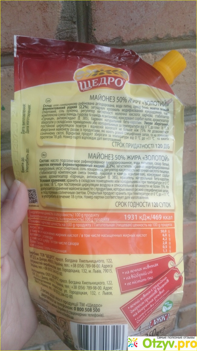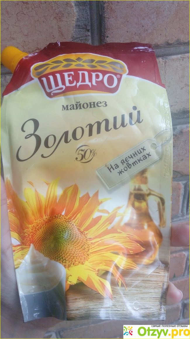 Я предпочитаю готовить домашний майонез, но иногда, когда совсем нет времени возиться с приготовлением домашнего или гости на пороге и нужно срочно заправить салатик, беру магазинный, но только от проверенного производителя. В последнее время беру от торговой марки Щедро, в частности майонез "Золотой" на яичных желтках.