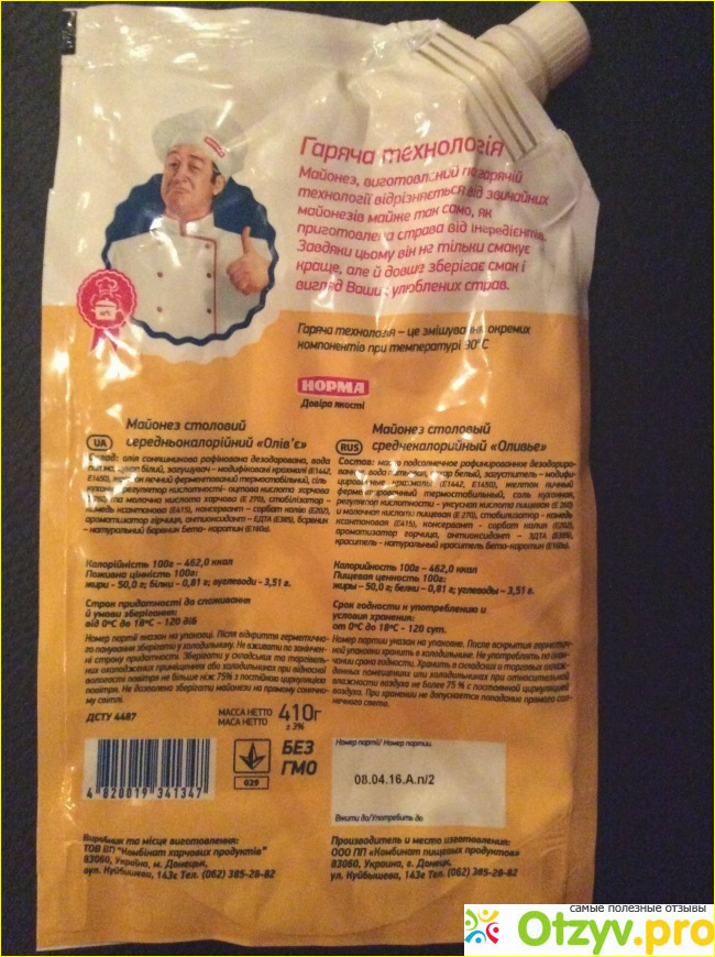 Производит ООО ПП "Комбинат пищевых продуктов" (ДНР, Донецк). Не содержит майонез "Оливье" ГМО. (По крайней мере, так утверждают производители). При этом, внимательно читая составляющие компоненты, я нахожу модифицированные крахмалы, кучу стабилизаторов и консервантов, красители. Как и главное - зачем в белейшего цвета майонез добавлены красители?