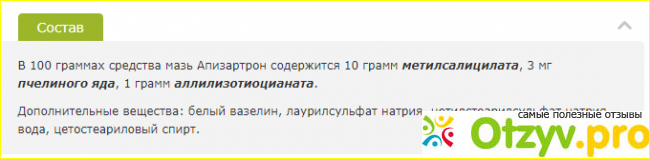 Мазь "Апизатрон" применяю на протяжении нескольких лет. Приобрела ее по рекомендации врача, который охарактеризовал ее как действенную и проверенную временем. Мазь на основе пчелиного яда, с достаточно хорошим анестезирующим эффектом.