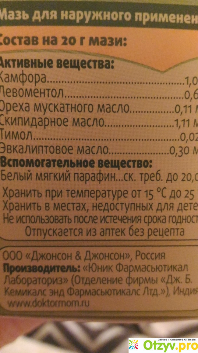 Состав абсолютно натуральный. Основные активные вещества: камфора, левоментол, масло мускатного ореха, скипидарное масло, тимол, эвкалиптовое масло., основой является белый мягкий парафин. Оказывает местнораздражающее, отвлекающее, антисептическое и болеутоляющее действие. Наносить необходимо только наружно, на неповрежденные кожные покровы. Желательно, место нанесения необходимо тепло укутать, для лучшего действия препарата.