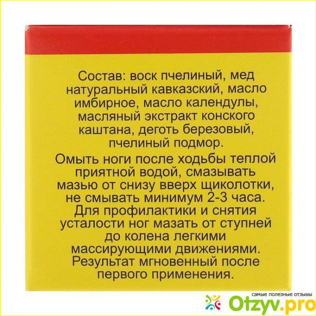 В нем содержатся: пчелиный воск, натуральный кавказский мед, пчелиный подмор, березовый деготь, масло имбирное, масло календулы, масляный экстракт конского каштана.