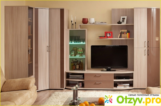 Эта гостиная мне тоже понравилась. Стенка занимает не очень большое место, достаточно места для книг. А если учесть, что у меня довольно большая библиотека, то этот вопрос для меня довольно актуален. Еще хорошо, что для телевизора в ней предусмотрено довольно большое пространство. Поэтому его хватит для любого по размеру телевизора.