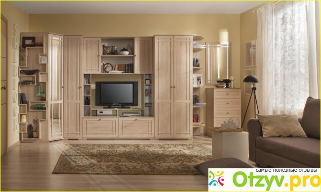 Очень понравилось, что он светлый и прекрасно будет смотреться у меня в гостиной. Ди и классический стиль мне вообще очень нравится. Очень хорошо все продумано. Тут и шкаф для одежды, и полочки для книг или каких-то мелочей. Да и для телевизора достаточно места.