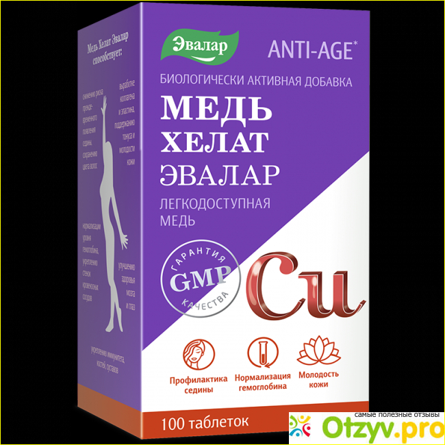 Лично я этим средством довольна, но собственно я и не ожидала подвохов, эвалар для меня лучшая отечественная компания, к тому же по выгодной цене. Упаковка из 100 (!) таблеток стоит 560 рублей, этой упаковки на 3 месяца приема хватит, так как принимать надо по 1 таблетке в день. У других фирм хелатная медь стоит гораздо дороже..
