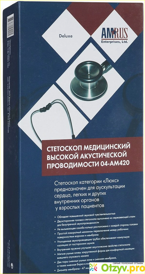 И, конечно, делать это надо с использованием только качественных стетоскопов, например, такой известнейшей фирмы-производителя, как американской Amrus. Особенно в отношении чёткости звуков, надёжности, прочности и долговечности изделия радует стетоскоп модели Amrus 04-АМ420. А что уж говорить о восторге от такого стетоскопа , когда он синего цвета! Его основные характеристики - это мягкие ушные оливы закруглённой формы для комфортной изоляции внешнего слухового канала, длина трубки 55 мм, диаметр мембраны 47 мм, диаметр воронки 35 мм, цвета - чёрный, синий, фиолетовый, красный, зелёный, но особенно синий. В комплекте - две пары сменных ушных олив и сменная мембрана, а так же именная пластина в комплекте. В общем, прекрасный стетоскоп, рекомендую.