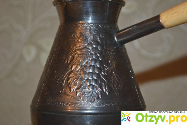 Турка мне нравится очень. Она изготовлена из меди, покрыта напылением с чеканкой в виде винограда.