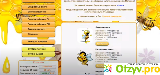 Так называется игра с потрясающей идеей заработка, от которой я просто в восторге. Картинка сайта четкая, яркая, понятная и простая вместе с тем. Пчелки натуралистичны и под каждой описание — какая она именно. Сказано ее название, тип, подразделение, сколько она может приносить меда и что надо делать, чтобы ее улучшить.