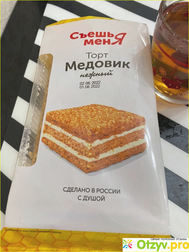 Выбирая что-то к чаю в магазине "Верный", нам приглянулся торт медовик с заманчивым названием "Съешь меня". Страна, где делался торт Россия. Также привлекло, что тортик без ГМО.