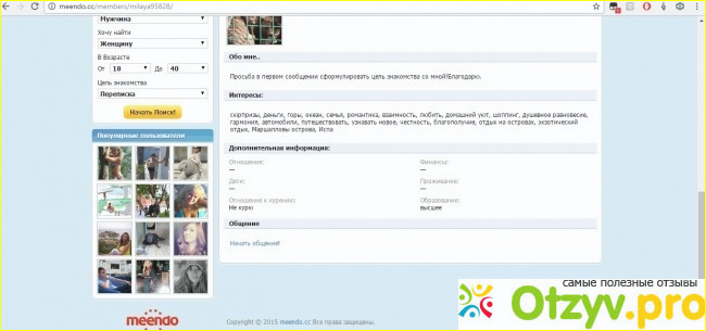 Я рекомендую сайт Меендо всем, кто ищет серьезные отношения или просто хочет найти интересных собеседников. Здесь вы найдете много людей, которые разделяют ваши интересы и готовы общаться. Регистрация на сайте очень простая и быстрая, и вы сразу же сможете начать общение.