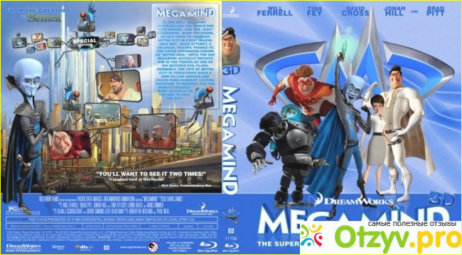 Под конец еще затрону сам диск, на котором и просматриваем эту комедию. "Мегамозг" в данном "качественном формате"(Blu Ray) идет в упаковке Keep case, полнометражка, длительностью в 90 минут, 5 языковых дорожек, имеются субтитры, формат изображения 1920х1080, Full HD. Кроме того, он в себя вмещает не просто отснятую картину, но и много познавательных моментов. Там есть удаленные сцены, что не вошли в цельный фильм, аудиокомментарии, голоса героев "Мегамозга" - оригинальные, информация о актерском составе (более расширенная, чем на обратной стороне "кейса" диска), анонсы, трейлер, игра, фотогалерея фильма, анимационный уголок. В общем, фильм с приятным багажем.