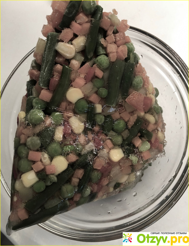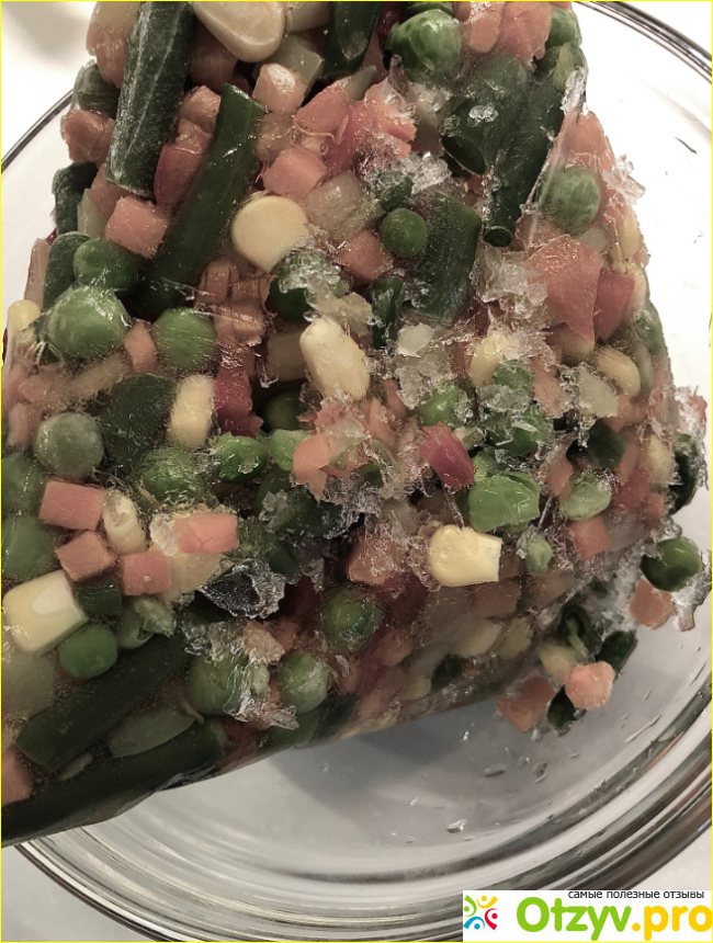 Обычное дело, скажите вы. Производитель не при чем, все дело в неправильной перевозке или хранении. Отсюда и столько льда. Но если присмотреться получше, то можно увидеть очень много интересных деталей, помимо льда. К примеру неаккуратную нарезку. Перец прямо покромсан, а не нарезан. Горошек местами жёлтый, в какую то белую крапинку. Фасоль жухлая, и идеально выглядит на всём этом фоне только ярко-желтая кукуруза. Она и, кстати, оказалась самая вкусная. Опыт не пропьешь, правда, Бондюэль?))