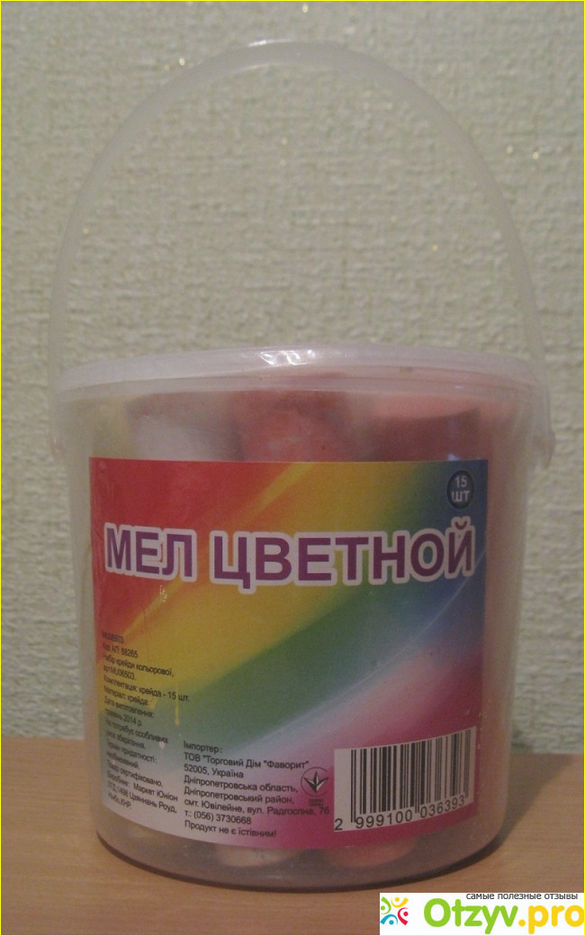 Итак, производитель – Китай. Товар сертифицирован, это не может не радовать – значит, могу предположить, что эти мелки не токсичные и так далее. Всего тут 15 мелков, но они не все разноцветные – цвета повторяются. Также тут указано, когда изготовлены мелки – в мае 2014 года. Есть на этикетке также информация об импортере этих мелков в нашу страну Украину. А еще можно увидеть тут цифры штрих-кода.