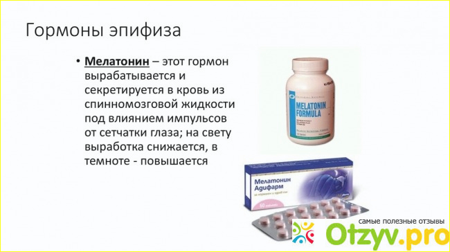 Мелатонин-это гормон, который вырабатывается эпифизом(шишковидной железой) в ночное время. Он способствует выработке в достаточнои количестве гамма-аминомаслянной кислоты и сератонина. Как известно, гамма-аминомаслянная кислота является тормозным медиатором(повышает стрессоустойчивость организма).