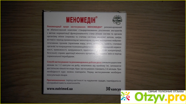 Рекомендуется принимать Меномедин 3-6 месяцев, по 1-2 капсулы в день. Количество капсул, вероятно, зависит от степени проявления симптомов. Я приняла одну упаковку, по одной капсуле в день. Получилась длительность приема месяц, так как в упаковке 30 капсул.