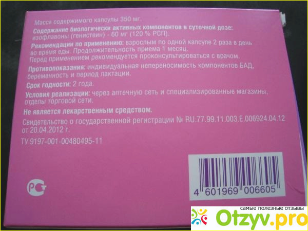Он содержит фитоэстроген (генистеин), который помогает женщинам в их нелегкий период. В упаковке 30 капсул, надо принимать 2 раза в день весь месяц, поэтому решила взять 2 штуки. Хорошо, что стоит недорого. Конечно в первые дни никаких изменений не почувствовала. Спустя 10 дней я заметила, что по утрам стало легче вставать на работу, приливов стало гораздо меньше.