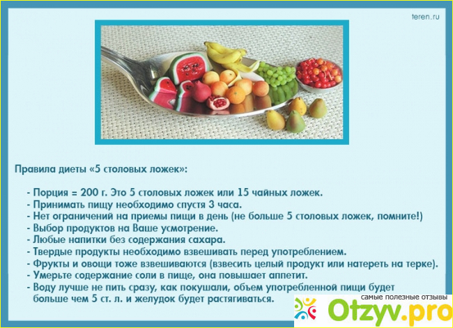 Многие, кто воспользовался диетой "пять столовых ложек" утверждают, что в течение одной недели сбрасывают до четырех килограмм. При этом они употребляют в пищу те продукты, которые использовали практически каждый день. Только немного нормализовав свой рацион. Если у вас минимальное количество килограмм, которые вы хотите сбросить. Поэтому нужно обращаться к этой диете обязательно.