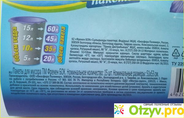 На упаковке указана информация о производителе, о номинальном количестве пакетов в данной упаковке, размер мешка, а так же состав, рекомендации по использованию и хранению.