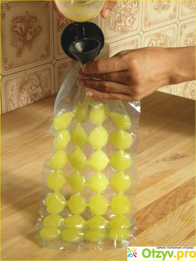 Далее этот пакет можно либо просто через лейку или кран заполнить водой, а если хотите какие то яркие кубики сделайте их из сока для алкогольных напитков самое то. Очень удобно то что когда пакет полностью наполняется жидкостью, он автоматически закрывается сам, то есть все герметично. Можете класть его в морозилку не опасаясь пролитой воды. Если у Вас мало места в морозилке вы можете как угодно сложить пакетик для льда, не боясь пролитой воды. Когда лед застынет его очень удобно от туда достать просто разобрав пленку, правда у меня иногда он выскальзывает с рук но это уже такое дело техники как говорится. Сам лед имеет очень красивую форму, а если Вы его еще делаете не просто из воды, он станет дополнением любой вечеринки или семейного ужина. Немаловажным плюсом является то что пакетики для льда не впитывают посторонние запахи холодильника.