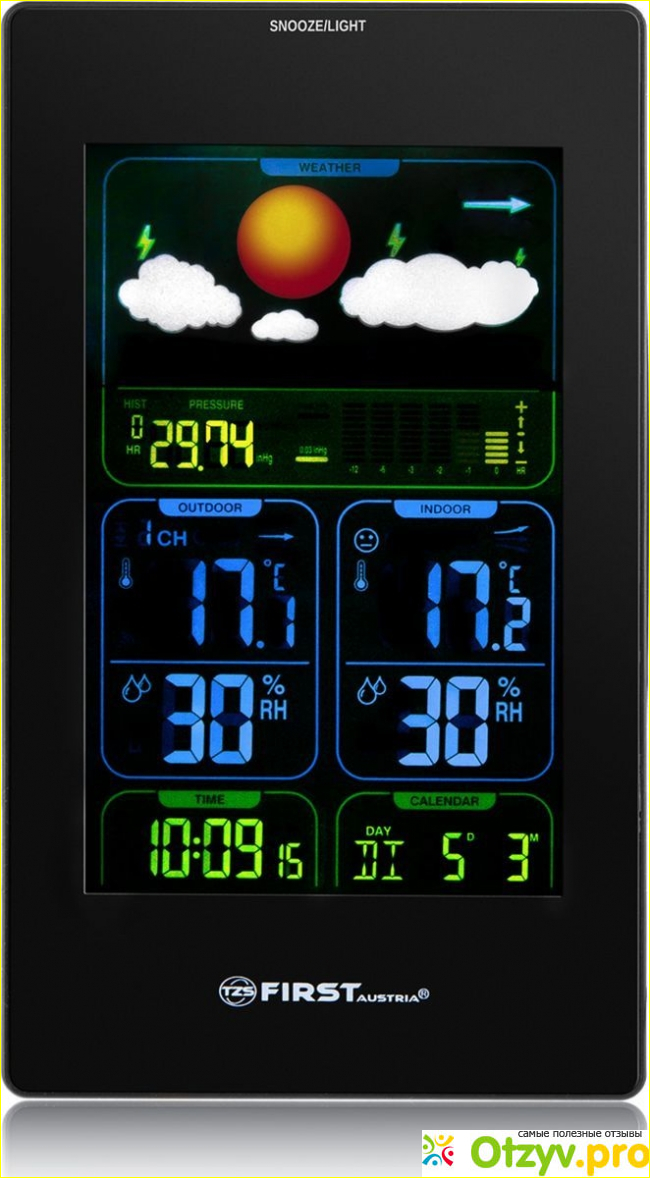 У меня всегда была большая проблема в том, как одеть детей по погоде. Но когда я купила метеостанцию First 2460-3. то все проблемы быстро решились . Прибор корректно показывает погоду в к доме и на улице, также мне нравится, что на нем можно посмотреть влажность в доме. Модель простая в управлении. А также в ней есть функции часов, календаря и будильника. Будильником правда мы не пользуемся, а вот часы и календарь нам нужные. В общем я очень довольная такой покупкой.