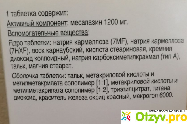 Основным действующим веществом этого дорогого лекарства выступает «месалазин», которого здесь 1200 миллиграмм. Также там находятся всякие незначительные компоненты, о которых я не буду здесь упоминать. Основное действующее вещество является производным 5-аминосалициловой кислоты. Как он воздействует на организм до конца не изучено, но было установлено, что средство оказывает местное противовоспалительное воздействие на эпителий кишечника.
