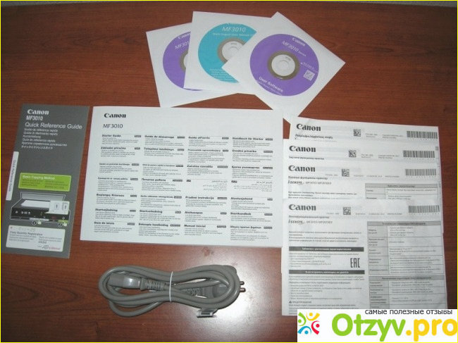 В комплект, помимо самого лазерного МФУ приложены диски с драйверами, их три штуки; инструкция по применению данного аппарата; гарантийный талон и сертификат качества; кабель питания и на этом все. Больше ничего нет.
