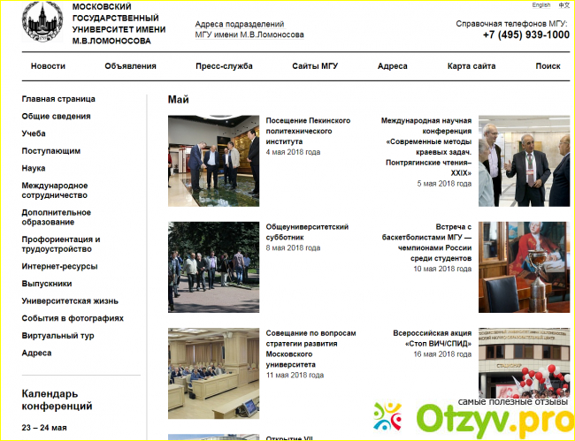 Ниже на официальном сайте МГУ имеется еще одна горизонтальная строка с вкладками. Первая из них касается новостей Московского государственного университета. Здесь по порядку перечислены все последние события, которые произошли в МГУ. Это и презентации, и встречи. Также в новостях имеется информация о том, что студенты Московского государственного университета стали лауреатами такой-то премии за границей. Указано, в какое время в МГУ прошел праздничный концерт, посвященный такому-то событию, написано когда МГУ посетил такой-то ученый и так далее. То есть это раздел различных памятных и значимых событий последнего времени, связанных с данным университетом.