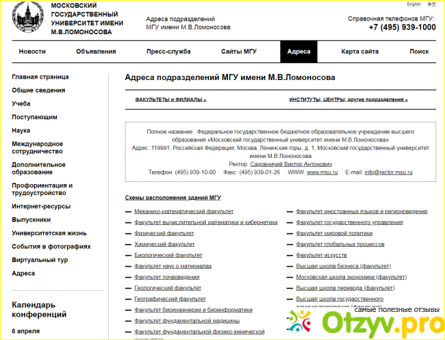 Следом за вышеперечисленной на официальном сайте МГУ идет вкладка, касающаяся адресов. Несмотря на то, что Московский государственный университет имеет в своем распоряжении главное и достаточно внушительных размеров здание, все таки места для всех имеющихся факультетов здесь не хватает, поэтому они раскиданы в Москве по разным адресам, которые здесь указаны, если внимательно ознакомиться с данным разделом.