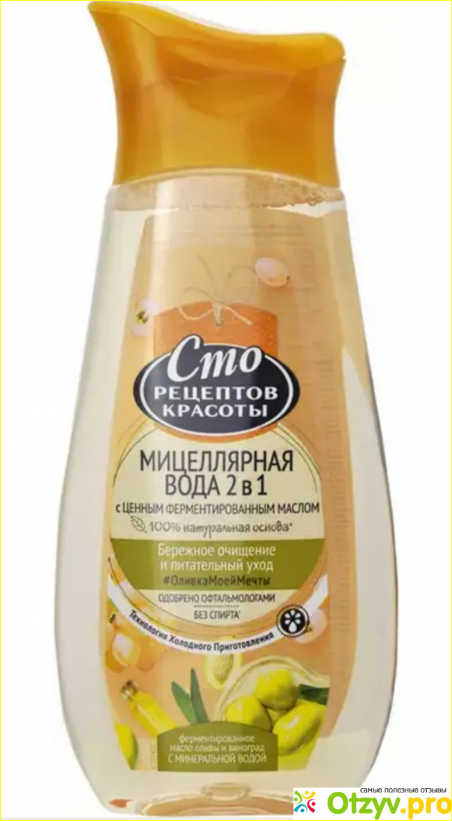 Оставляю свой отзыв о мицелярной воде 2 в 1 Сто рецептов красоты. Это средство для снятия макияжа с лица, глаз и губ с ферментированным маслом оливы и винограда, и с минеральной водой. Продукт не содержит спирт.