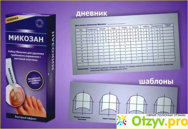 Для оценки эффективности лечения рекомендуется 1 раз в месяц отмечать размер пораженного участка ногтевой пластины в специальных шаблонах, которые также прилагаются к комплекту. Так можно оценить динамику выздоровления.