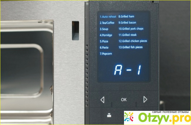 В данной микроволновой печи предложено множество новых (именно для микроволновых печей) функций. Конечно же, грилем, уже трудно кого удивить, данная функция здесь, без сомнения имеется. А вот помимо гриля здесь ещё есть автоматическое приготовление различных блюд. Для этого нужно ввести продукт, его количество и вес, а уж машинка автоматически подберёт для него нужное время приготовления, температуру и так далее. Мне эта функция напоминает в точности мультиварку, где почти к каждому блюду имеется своя собственная программа приготовления. Правда, как на деле оказалось, не всегда техника в этом плане точно всё угадывает. Как по мне, так лучше вручную самой установить время и температуру приготовления того или иного блюда, а то нередко получается, что продукт или переварится или же ещё остаётся сырым.