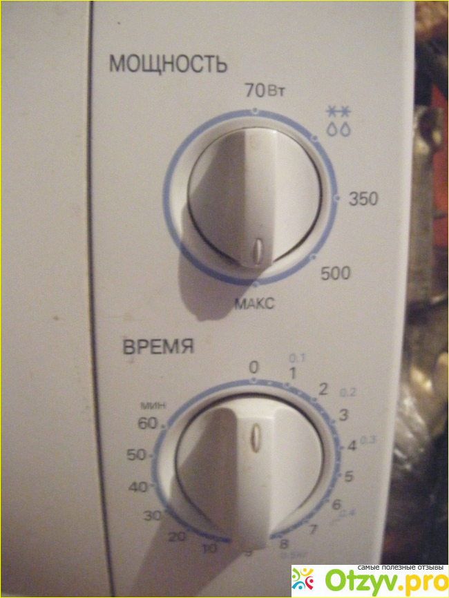 В микроволновки нет навороченных функций и управляется она при помощи двух поворотных ручек, первая для установки мощности (от 7-700 Вт), вторая для установки времени (от 0-60 минут).