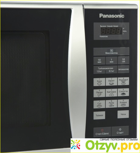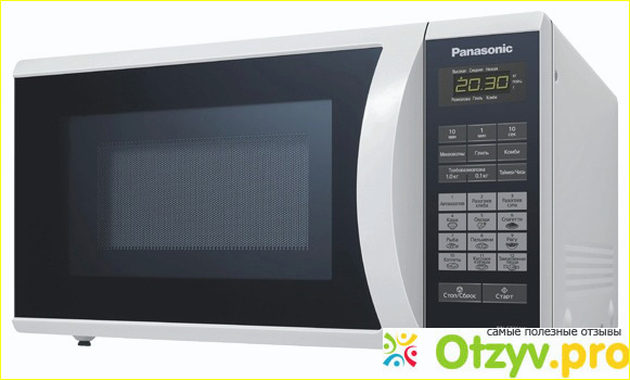 Микроволновая печь Panasonic NN-GT352WZPE имеет очень стильный и современный вид и дизайн. Корпус микроволновой печи - белого цвета с тёмным стеклом и панелью, на которой расположен дисплей. Размеры микроволновой печи составляют в ширину - 48,5 см, в глубину - 40 см и в высоту 28,7 см. Внутренний объём камеры - 23 литра. Изнутри камера покрыта эмалью. В камере находится поворотный поддон, диаметр которого равен 28,5 сантиметров. В микроволновке имеется верхний гриль, мощностью 1000 Вт. В комплекте к печке идёт специальная решётка для гриля. На СВЧ-печи Panasonic NN-GT352WZPE максимальная мощность микроволн - 800 Вт, что вполне хватает для разогрева и приготовления продуктов. Управление микроволновой печью осуществляется с помощью электронного управления сенсорными переключателями, а действия отображаются на дисплее. В микроволновке предусмотрены функция разморозки продуктов, в том числе и автоматическая разморозка, а так же автоматический разогрев и автоматическое приготовление. Есть и функция быстрой разморозки. На микроволновой печи Panasonic NN-GT352WZPE имеются девять программ автоматического меню для приготовления популярных русских блюд. Предусмотрена подсветка камеры. После завершения заданной программы микроволновая печь сигнализирует об этом с помощью звукового сигнала. Имеется блокировка от детей. Дверца у СВЧ-печи навесная. Удобное открывание и закрывание дверцы осуществляется с помощью нажатия кнопки и удобной ручки. Гарантия на микроволновую печь установлена производителем на один год.