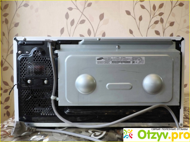 На задней стороне печи есть крепление шнура электропитания (длина которого 80 – 90 см), он прикреплён к корпусу. Здесь же есть дополнительная металлическая защита от СВЧ – излучения, и размещена необходимая информация для потенциального покупателя: серийный номер изделия, страна-изготовитель, источник питания, потребляемая мощность и класс защиты.
