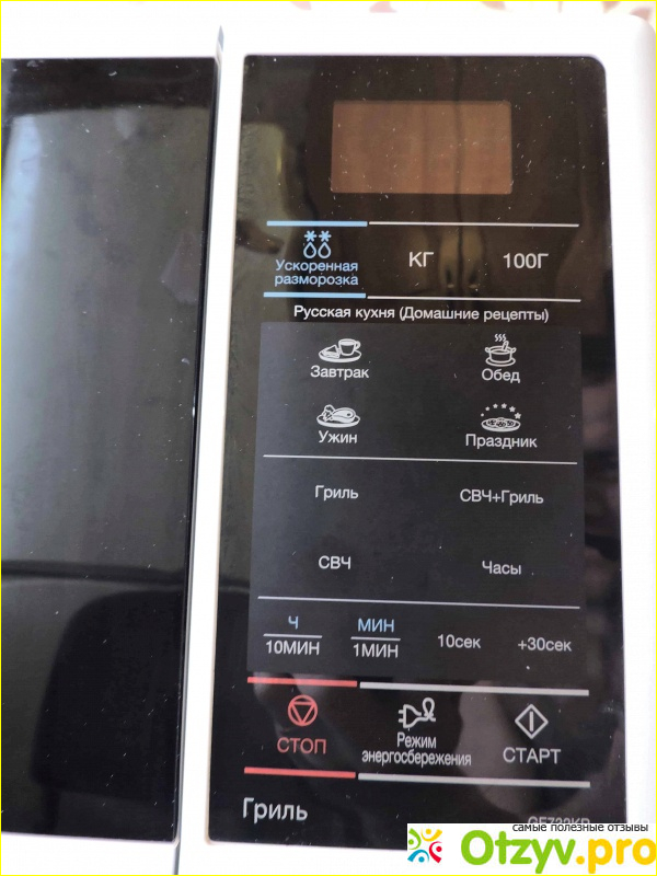 В этой модели микроволновой печи есть необходимый минимум программ. Они указаны на русском языке непосредственно на лицевой поверхности.