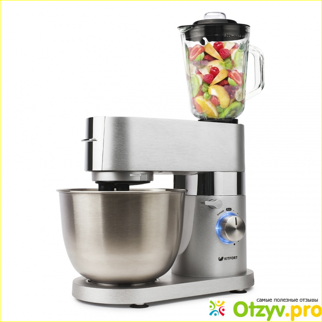 Объем чаши миксера, изготовленного из нержавеющей стали составляет – пять с половиной литров, чаши блендера – стеклянной – полтора литра.