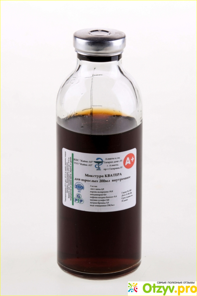 Микстура Кватера имеет сложный состав, включающий настой корней валерианы, экстракт листьев перечной мяты, амидопирин, сульфат магния, бромид натрия, кофеин-бензоат натрия и дистиллированную воду. Все компоненты соединяются в определенных пропорциях, которые не изменялись со временем, чтобы обеспечить максимально эффективное воздействие на организм.