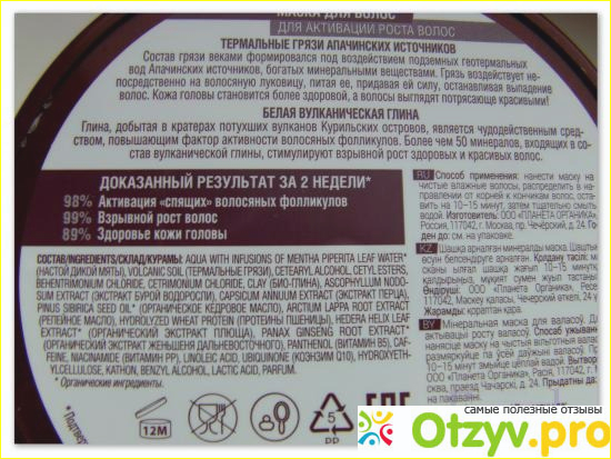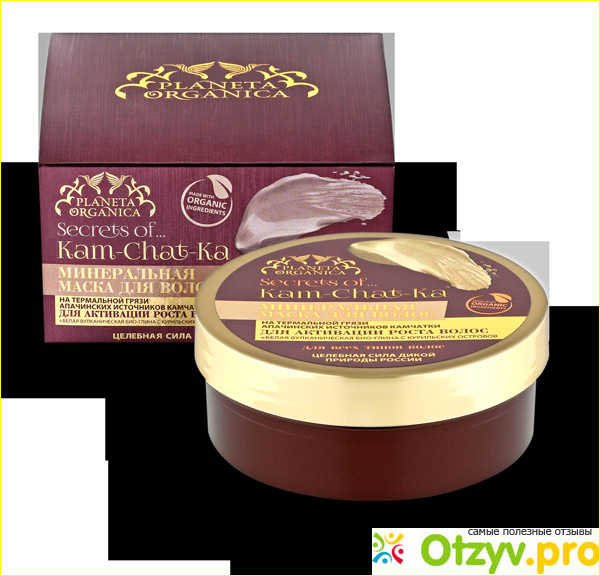 Сама коробочка, как и баночка от маски, оформлены просто шикарно: золотые, выгравированные бувы на бордовом фоне выгодно выделяются. На лицевой стороне как коробочки, так и баночки написано название фирмы производителя и наименование продукта. Далее на обратной стороне коробки и внизу, на доннышке, банки дана информация о составе и полезных свойствах средства. Привлекает и немного завораживает, что сделана она на основе термальных грязей с источников камчатки и белой глины, добытой на курильских островах. Помимо всего перечисленного в состав входят и отвары трав. В общей сложности, с учетом всех полезностей, маска содержит более 50 минералов. Она благотворно влияет на состояние волос и кожи головы.