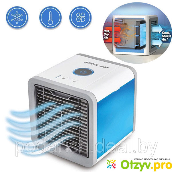 Привлек мое внимание кондиционер маленькими размерами: семнадцать на семнадцать на семнадцать, который можно поставить на стол, подоконник, тумбочку.