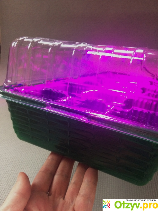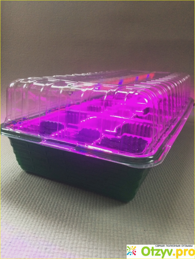 В фито светильнике, встроенном в крышку парника есть ряд синих и красных светодиодов. Их сочетание дает максимально комфортный свет для растений.