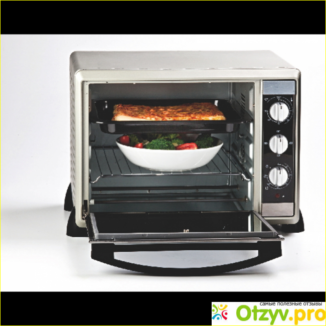 Сама мини-печь выглядит довольно современно, она больше даже похоже на обычную микроволновку, только большего размера. И дверца у нее открывается не в боку, а снизу вверх. Но зато данную мини-печь совершенно не сравнить с теми моделями которые выпускались во времена моей мамы.