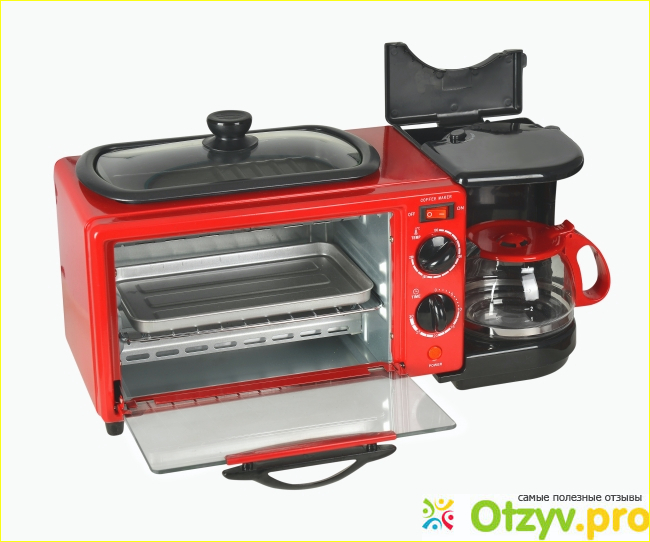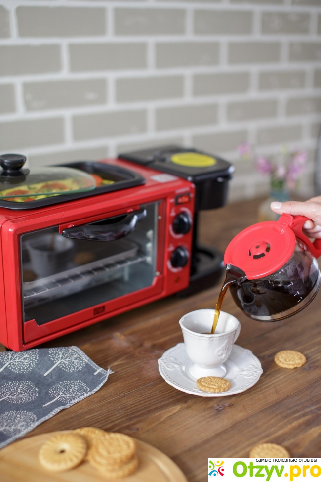 По сути, в одном механизме соединены сразу три электроприбора: гриль для поджаривания, духовка для выпекания и капельная кофеварка, которая приготовит ароматный кофе и сохранит его тёплым. Ёмкость чаши для кофе – 600 мл.