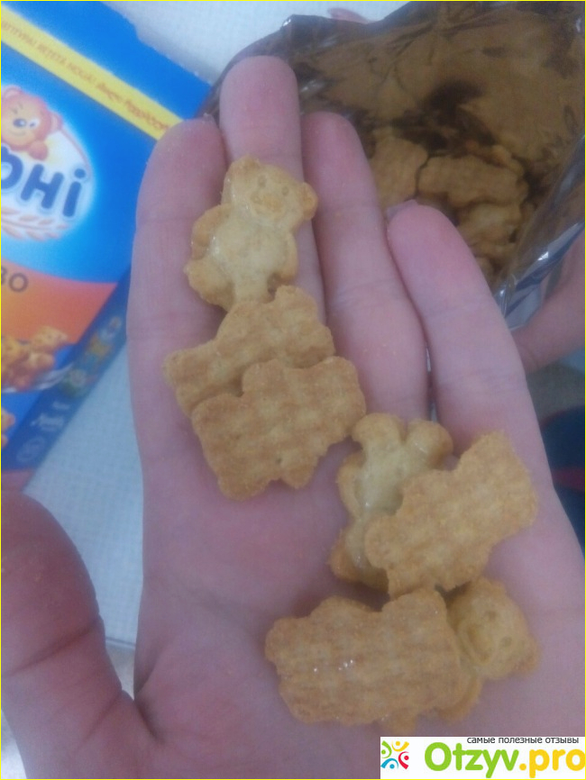 сами печенюшки имеют вид медвежат, очень маленькие, вкус у них хрустящий.