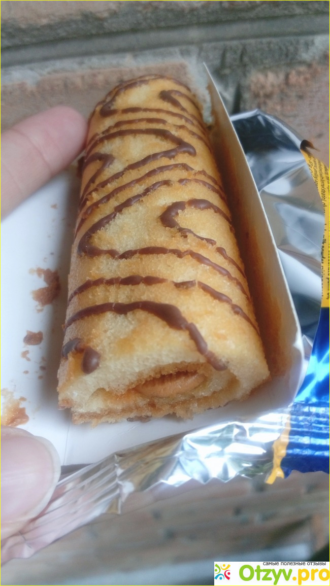 Рулетик с бисквитного теста, красиво завернут. Внутри вкусная начинка со сгущенки.
