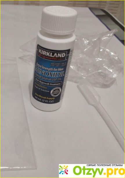Я приобрела его версию от компании из Израиля Kirkland. В моём случае миноксидил был 5 %. Для лучшего втирание в волосы препарат был смешан с пропиленгликолем. Выпускается в небольшой коробочке, где находится флакон и пипетка для нанесения препарата. Применять его необходимо ежедневно и одного флакона примерно должно хватить на месяц.