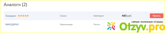 В качестве аналога можно выбрать Экзодерил, который стоит от 132 до 186 гривен. А также Микодерил, который у нас, в Украине стоит от 450 гривен до 850 гривен. А в России 411 рублей. То есть, почти в три раза дешевле средство можно купить в России.