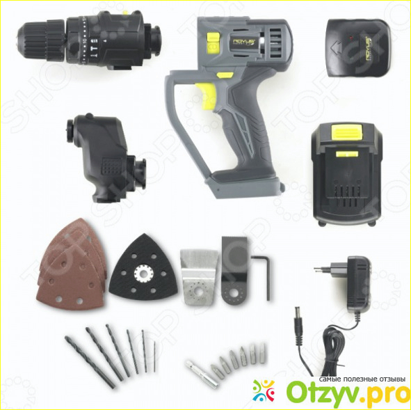 За счет головки шестерни вам обеспечена надежность при выполнении работ. В комплекте вы получите еще и сверлильную головку и головку молотка. Их предназначение – сверление и вывинчивание шурупов из поверхностей любого типа. Вместе с профессиональным инструментом прилагается набор сверл, насадка специальная для связанных с декором работ, шлифовальная головка, наждачка, скребок и другие комплектующие, которые вам пригодятся. Зарядка для аккумулятора тоже идет в комплекте.