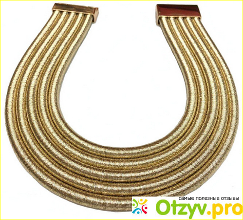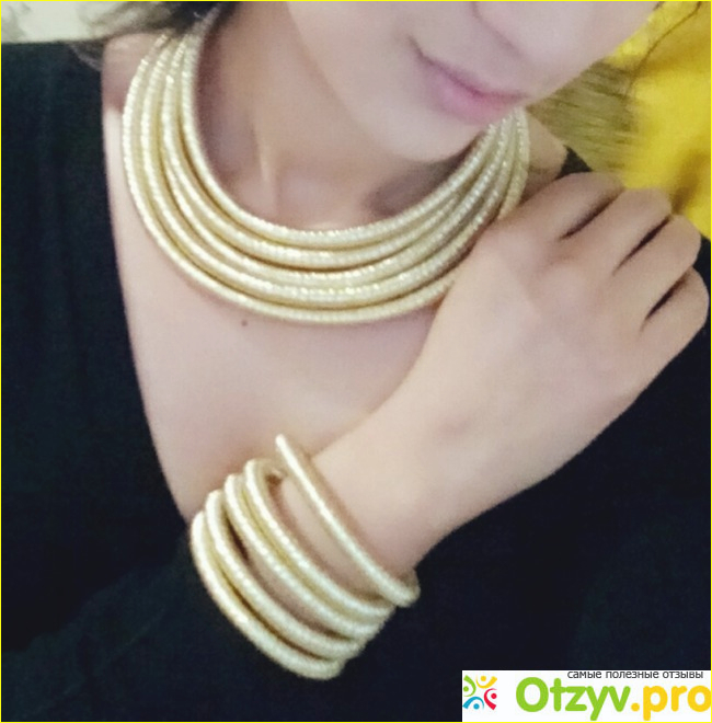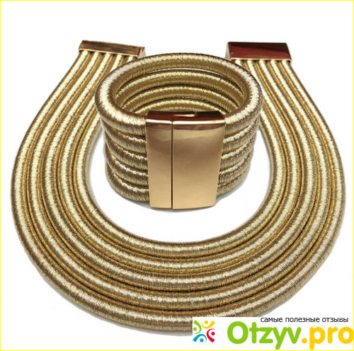 Ожерелье, как и браслет, многослойное (5 слоёв), застёжка магнитная. Клеопатра носила такие многослойные украшения и в наши дни такая бижутерия набирает популярность. Ожерелье хоть и тяжёленькое, но очень красивое. Смотрится элегантно на изящной женской шее. Каждый из пяти элементов колье плотно обмотан золотистой ниткой.