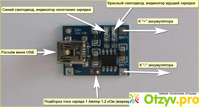 Если нужно уменьшить зарядный ток, например в 10 раз, до 100 мА, нужно увеличить сопротивление этого резистора, (отмечен на фото), примерно тоже в 10 раз, до 123, 12кОм, 12000 ом. При работе модуль индицирует заряд горением красного светодиода, при полной зарядке, (до 4,2 Вольт), оно отключает аккумулятор, Вы его не перезарядите, при этом красный гаснет и загорается синий светодиод. При монтаже внутри самоделки нужно предусмотреть в этом месте отверстие, чтобы светодиоды были видны. Возможно, кому то последнее покажется смешным, но новичков я хочу предостеречь: устройство не годится для зарядки других типов аккумуляторов, кроме литий - ионных: никель - металлогидридных, кобальтово - никелевых и т. д.